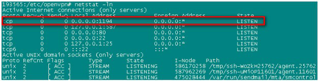 使用netstat -ln 查看1194openvpn的端口是否已经起来