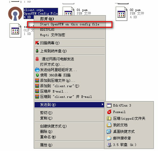 确保与服务端的配置对应,然后将client.conf修改文件名为client.ovpn,右键点击client.ovpn,选择"Start OpenVPN on this config file"