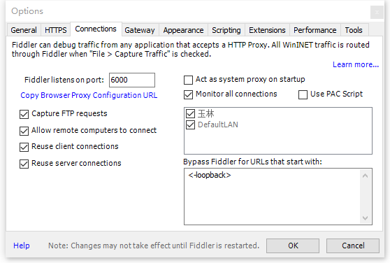 4,在Connections中勾选下图选项,Fiddler listens on port后面的格子里写6000