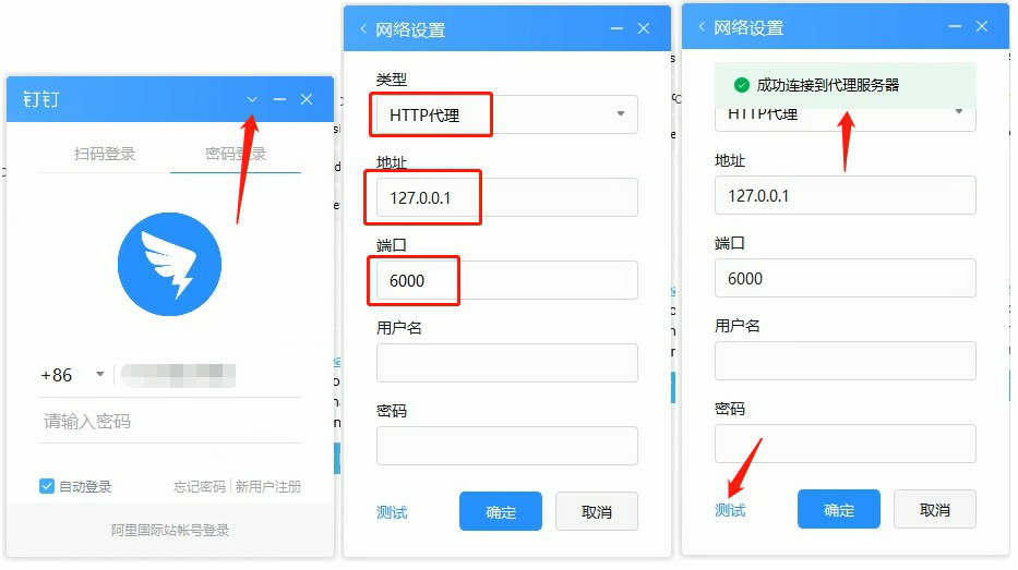 5,保持该软件不动,打开钉钉登录页面,登录前选择下方位置按钮,并选择和录入以下内容,点击左下角的测试,提示成功连接后,点确定返回,然后登录钉钉账号