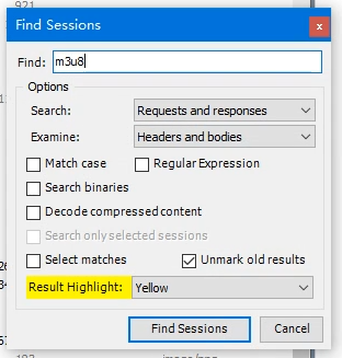 7,此时在Fiddler软件中会出现抓到的数据包,用搜索方法找到M3U8文件链接(请根据文件大小和其实际内容自行判断正确的m3u8文件)