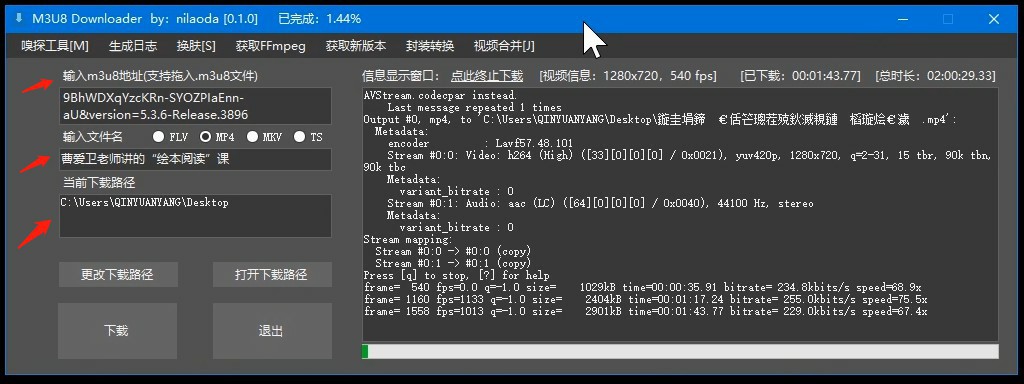 9,打开M3U8 Downloader软件,分别粘贴链接到下载框、写个文件名、设置个存放位置,然后点下载