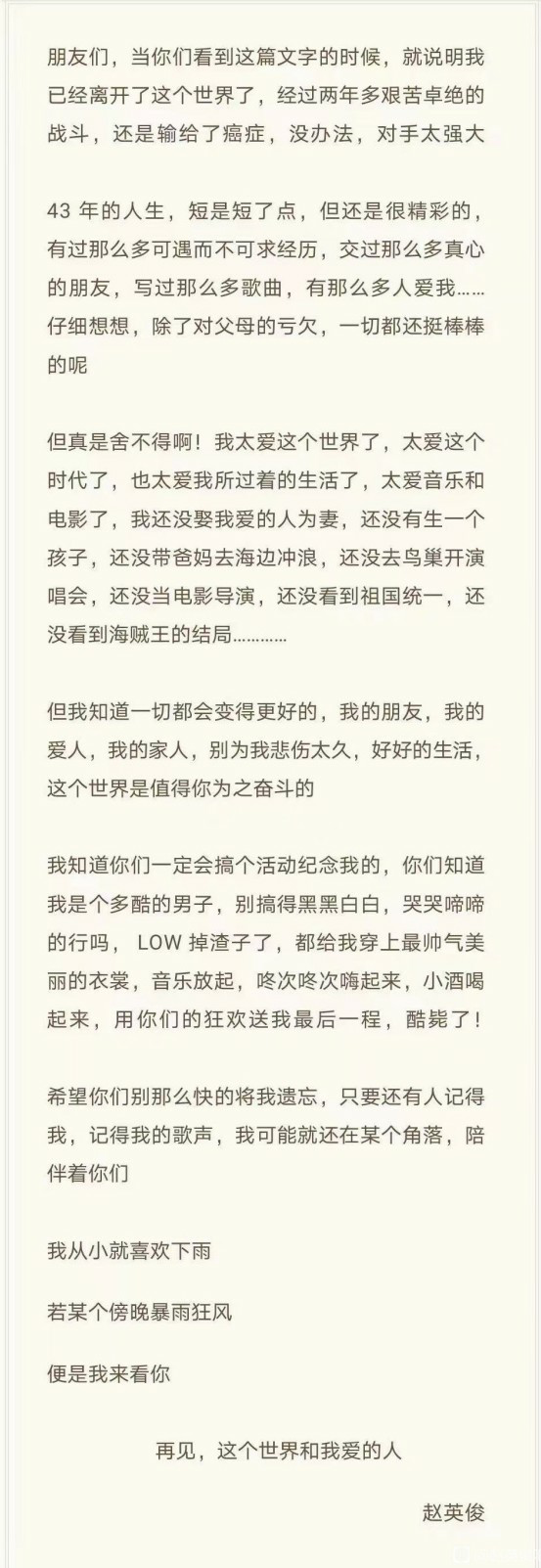 但真是舍不得啊!我太爱这个世界了,太爱这个时代了,也太爱我所过着的生活了,太爱音乐和电影了,我还没娶我爱的人为妻,还没有生一个孩子,还没带爸妈去海边冲浪,还没去鸟巢开演唱会,还没当电影导演,还没看到祖国统一,还没看到海贼王的结局....……