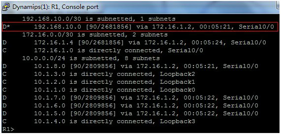 图三,R1和R2里的路由表,红框里的是通过EIGRP得到的路由条目,说明有效。