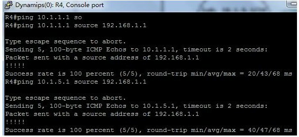 图四,在外部中路由上测试连通性,用外部子网的IP测试,连通正常,说明默认网络有效。
