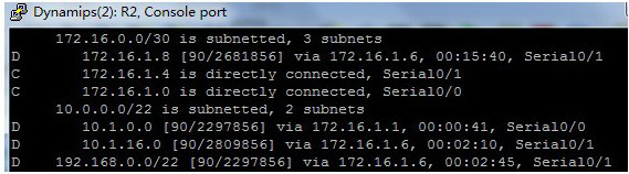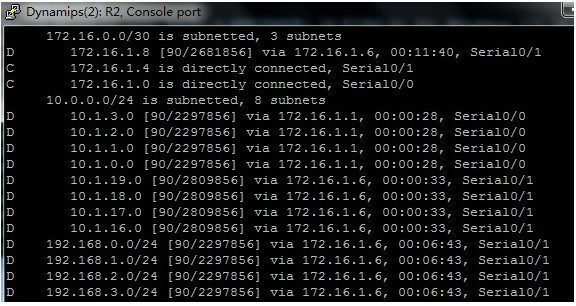 每个路由器配置完基本的EIGRP信息后,在R2上的路由表: