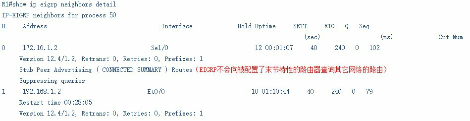 通过配置完汇总,可以看到本次查询中还是有四次,有了汇总还是会查询汇总,这里看不到效果,但实际应用中这种做法还是有可能有效的,为了能彻底解决此问题,在R2上配置EIGRP stub(末节)特性,某些不必要的查询。