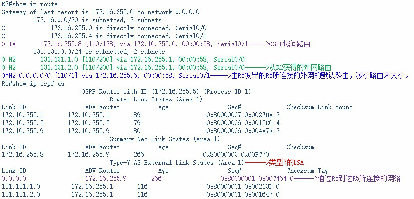 类为完全次末节区域和完全末节区域相似的是:丢弃类型3、4、5的LSA,所以此处把默认路由转发类型7的LSA,以便向R2通告。