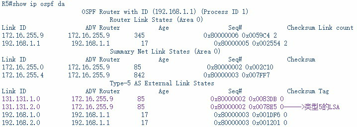从R2收到的类型7的LSA,此类型的LSA到达区域边界路由器(ABR),R4会转化成类型5的LSA向其它OSPF区域通告。