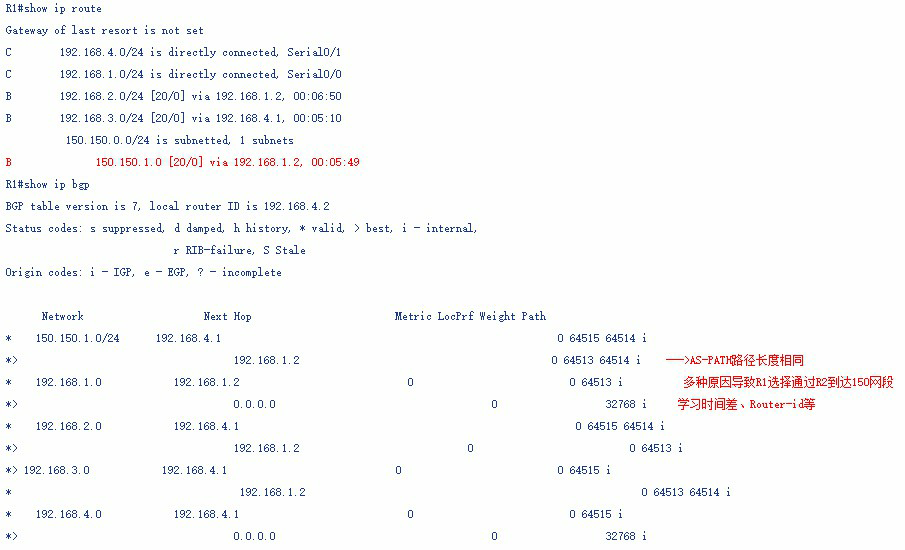 * 150.150.1.0/24 192.168.1.2 0 64513 64514 64514 i ---->路径变长了,不选这个